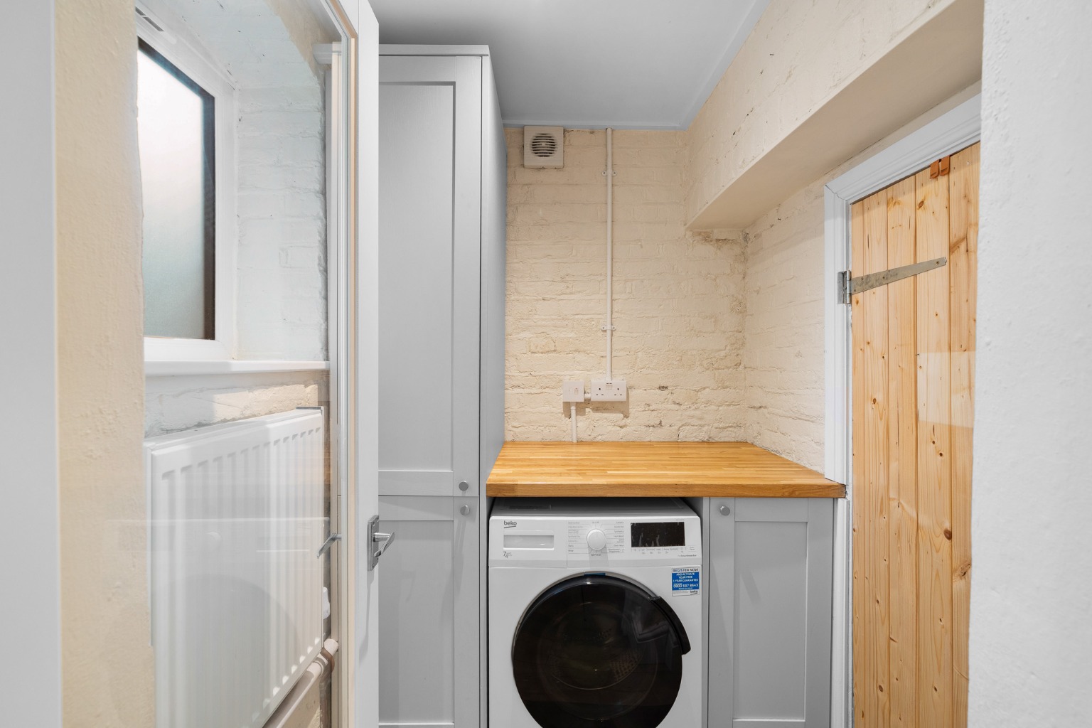 The flat features a well-proportioned reception room, providing ample space for relaxation and entertaining. The patio doors leading to the private garden, allows for natural light to come in and create a bright atmosphere. The newly fitted kitchen is designed for both functionality and style, equipped with modern appliances and sleek cabinetry. A significant practical advantage is the separate utility room, offering dedicated space for laundry and additional storage, keeping the main living areas clutter-free and enhancing the overall functionality of this home.